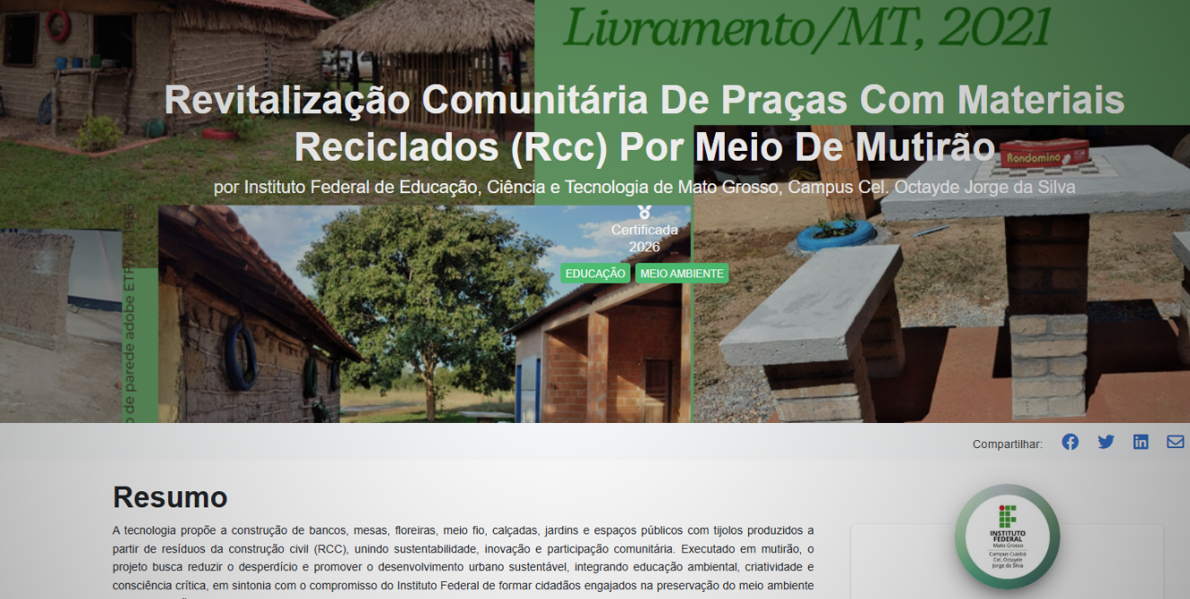 Uma iniciativa inovadora da professora Juzélia Santos, do Departamento de Infraestrutura (Dinfra), do IFMT Campus Cuiabá Octayde Jorge da Silva, mostrou que o que antes era visto como entulho pode se transformar em desenvolvimento social e ambiental. A pesquisa, inclusive, garantiu para a instituição uma certificação na 13ª edição do Prêmio Fundação Banco do Brasil de Tecnologia Social, sendo validada em meio a outras de todo o Brasil.